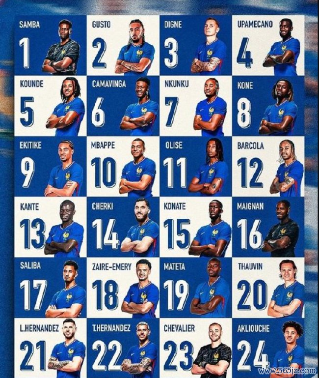 后卫:2-古斯托、3-迪涅、4-于帕梅卡诺、5-孔德、15-科纳特、17-萨利巴、21-卢卡斯-埃尔南德斯、22-特奥-埃尔南德斯