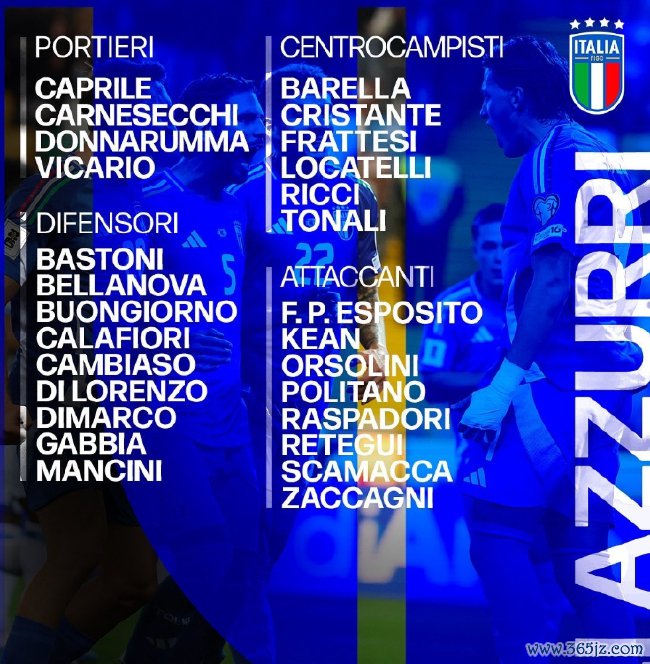 11月海外比赛日历间,意大利将会在欧洲区寰球杯预选赛中先后对阵摩尔多瓦和挪威。